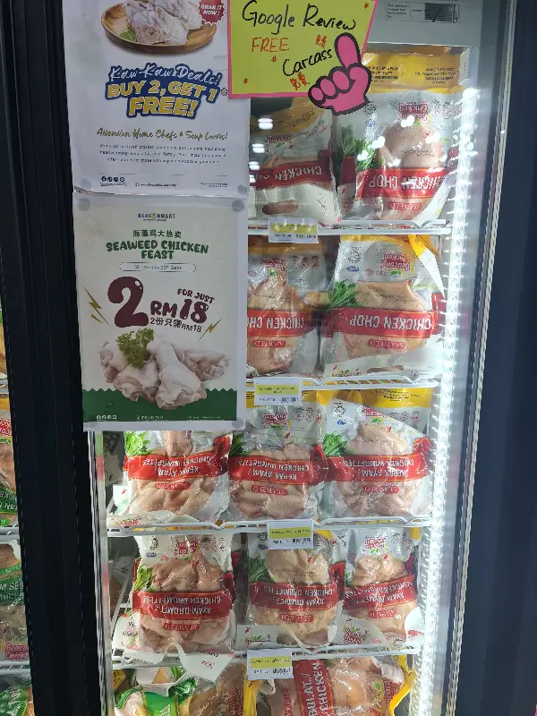 냉장 쇼케이스 안에는 다양한 종류의 닭고기가 가지런히 진열되어 있습니다. “Buy 2 Get 1 Free” 프로모션이 눈에 띄네요.