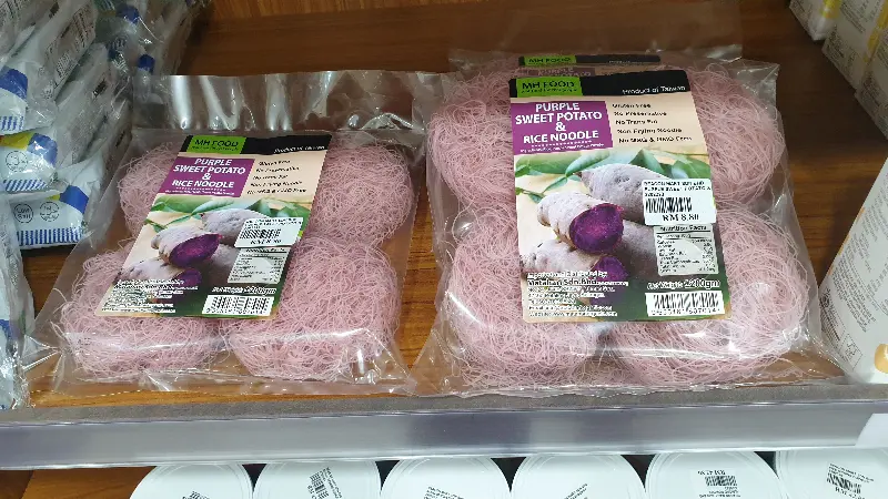 보랏빛 자태를 뽐내는 자색 고구마 쌀국수. 독특한 색감과 건강한 재료가 시선을 사로잡습니다.