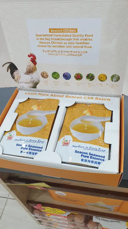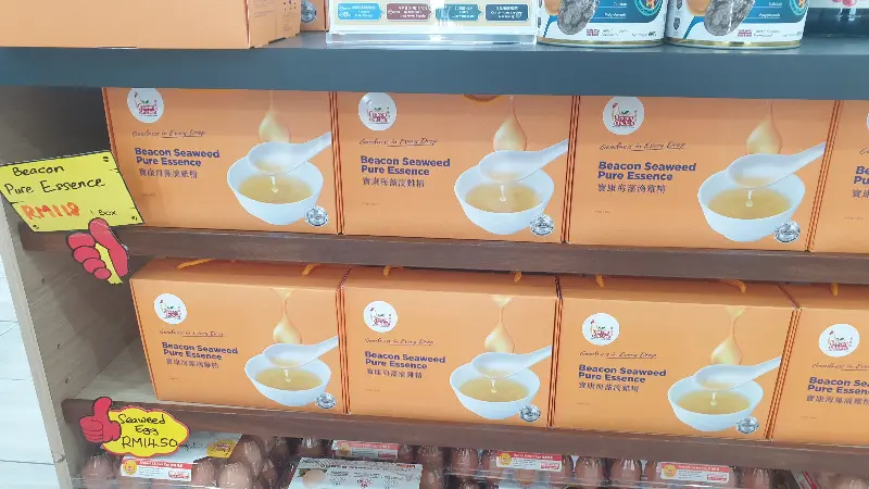 진열대 가득 채워진 해초 닭고기 에센스. 건강을 생각하는 고객들에게 인기가 많습니다.