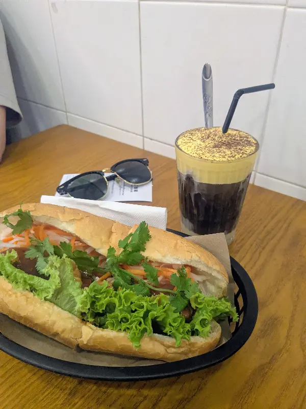 우리는 이곳의 대표 메뉴인 반미를 맛보기로 했다. 남자친구는 단연 최고라는 오타 반미를, 나는 촉촉한 닭다리살 반미를 골랐다. 주문 후 잠시 기다리는 동안, 카페 안을 둘러봤다. 테이블은 몇 개 없었지만, 길가에 놓인 작은 스툴 자리가 눈에 띄었다. 마치 베트남 현지 커피숍에 온 듯한 느낌! 다음에는 꼭 저 자리에 앉아 여유를 즐겨봐야겠다고 생각했다.