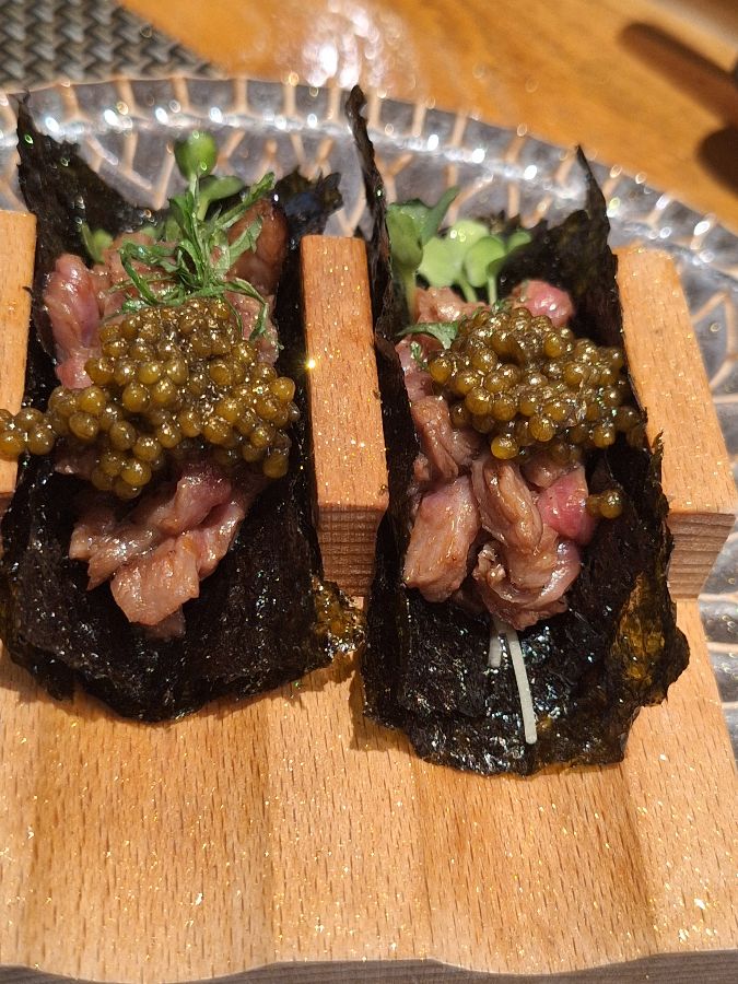 이곳의 요리들은 단순한 식사를 넘어 요리 예술성을 보여줍니다. 와규와 함께 제공되는 밥은 다양한 토핑과 함께 더욱 풍성한 맛을 선사합니다. 와규 덮밥 위에 캐비어와 연어알, 신선한 채소들이 올라간 모습은 그 자체로 한 폭의 그림 같으며, 눈과 입을 동시에 즐겁게 합니다.