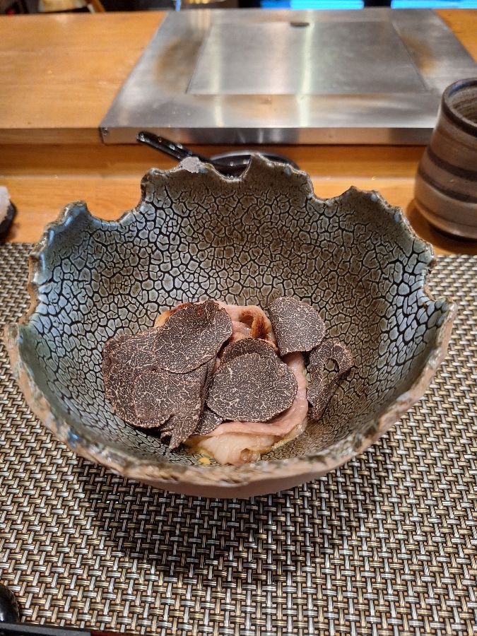 또 다른 인상적인 메뉴는 트러플이 듬뿍 올라간 요리입니다. 독특한 질감의 그릇에 담긴 이 요리는 얇게 슬라이스 된 블랙 트러플이 재료 위에 아낌없이 뿌려져 있어 그 향만으로도 이미 미식의 경지로 이끌어갑니다. 트러플의 진한 향과 어우러지는 재료 본연의 맛은 잊을 수 없는 경험을 선사합니다.