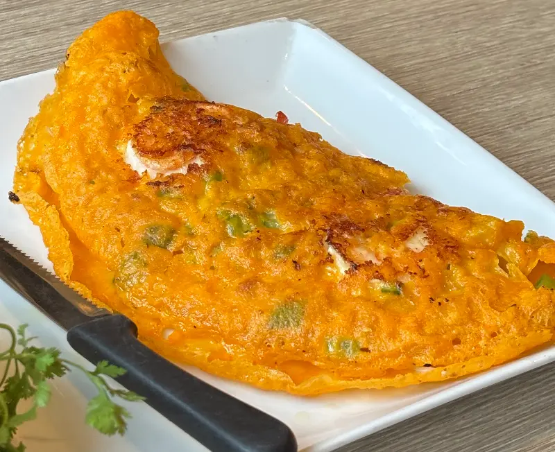 바삭한 식감이 매력적인 베트남식 부침개, 반쎄오도 맛보았습니다. 얇게 부쳐진 반쎄오 안에는 숙주, 새우, 돼지고기 등이 푸짐하게 들어 있었습니다. 겉은 바삭하고 속은 촉촉한 반쎄오는 정말 환상적인 맛이었습니다. 특히, 곁들여 나온 소스에 찍어 먹으니 더욱 풍성한 맛을 느낄 수 있었습니다.