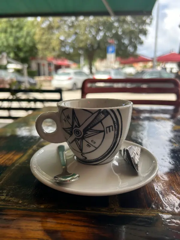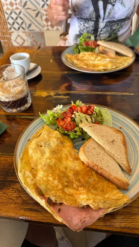 아침 일찍 서둘러 레스토랑에 도착했습니다. 아직은 한산한 분위기였지만, 야외 테라스 자리는 이미 몇몇 손님들로 채워져 있었습니다. 짙은 나무색 테이블 위에는 작은 에스프레소 잔과 설탕 봉지가 놓여 있었습니다. 저는 따뜻한 아메리카노 한 잔과 오믈렛을 주문했습니다. 잠시 후, 김이 모락모락 나는 커피와 함께 오믈렛이 나왔습니다. 노릇하게 구워진 오믈렛 옆에는 신선한 샐러드가 곁들여져 있었습니다.