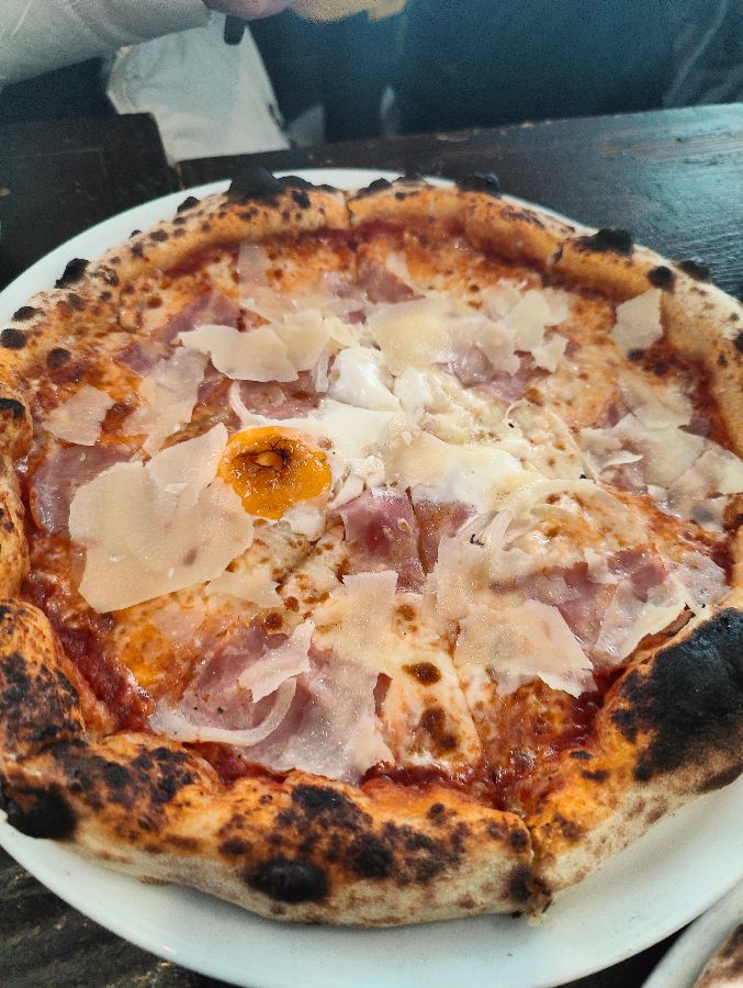 짭조름한 햄과 부드러운 치즈, 그리고 반숙 달걀 노른자가 시선을 사로잡는 피자. 고소함의 극치를 보여줍니다.
