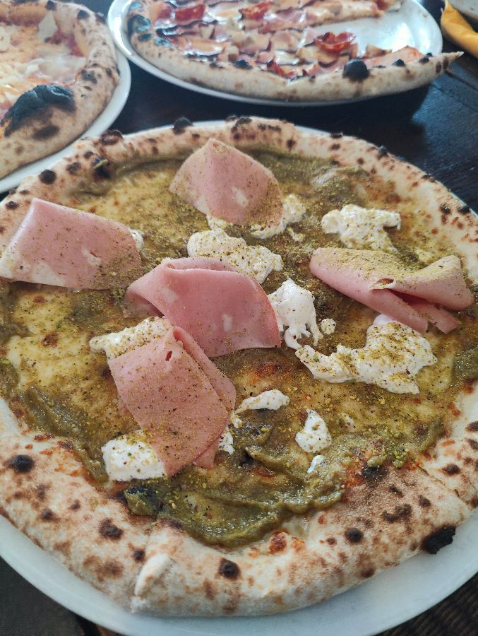 피스타치오 크림 베이스와 모르타델라 햄, 리코타 치즈가 어우러진 이색적인 피자. 오감을 자극하는 색감과 맛이 특징입니다.