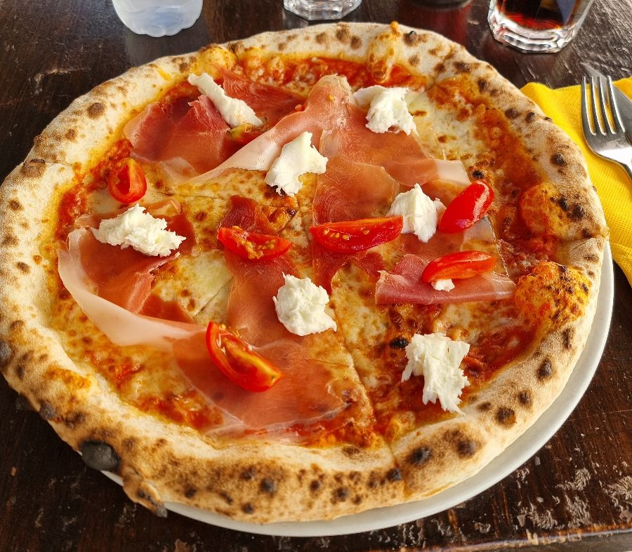 프로슈토 햄, 신선한 토마토, 크리미한 치즈가 듬뿍 올라간 피자. 화려한 비주얼만큼 맛도 훌륭합니다.