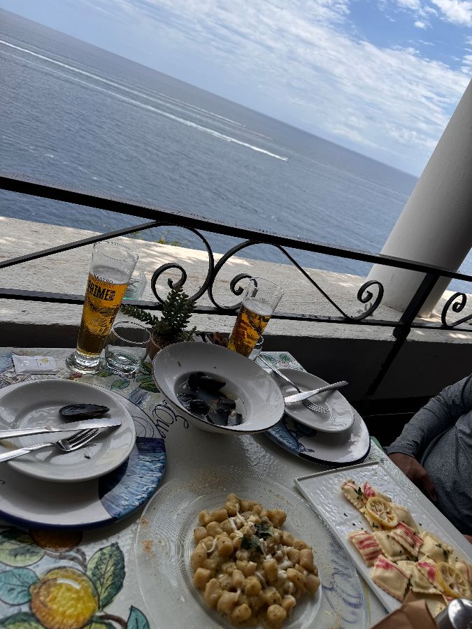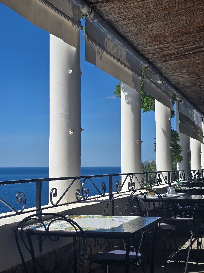 레스토랑 바로 옆으로는 아말피 해안 도로가 지나갑니다. 식사를 하면서 눈부신 햇살 아래 빛나는 바다와 해안 도로를 달리는 차량들을 감상할 수 있었습니다. 특히 탁 트인 바다를 배경으로 펼쳐지는 풍경은 마치 한 폭의 그림 같았습니다.