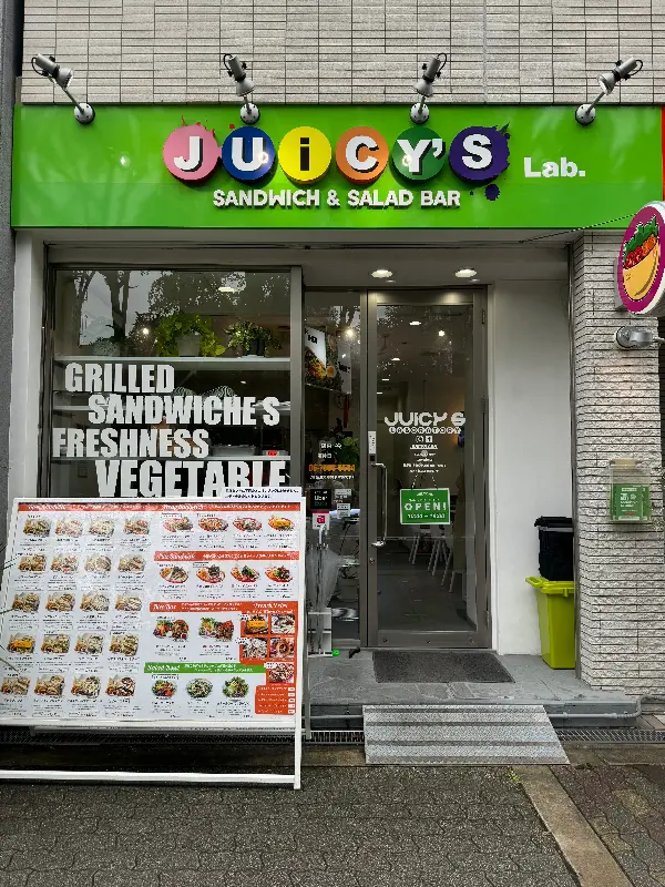 가게 앞에 도착하니, 사진으로 보던 것보다 훨씬 더 눈에 띄는 외관이 나를 반겼다. 싱그러운 초록색 간판에 큼지막하게 적힌 “Juicy’s Lab.”이라는 글자가 시선을 사로잡았다. 마치 실험실을 연상시키는 이름처럼, 톡톡 튀는 개성이 느껴졌다. 가게 앞에는 메뉴판이 놓여 있었는데, 다양한 종류의 샌드위치와 샐러드 사진들이 식욕을 자극했다.