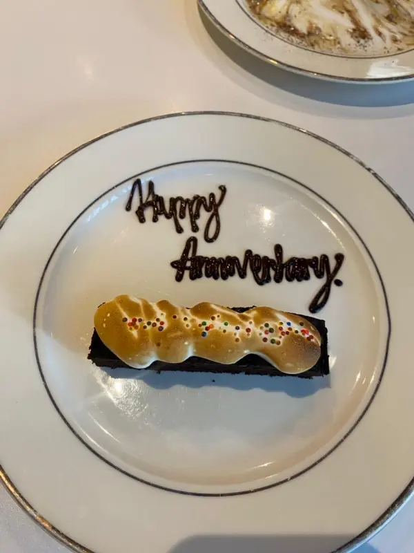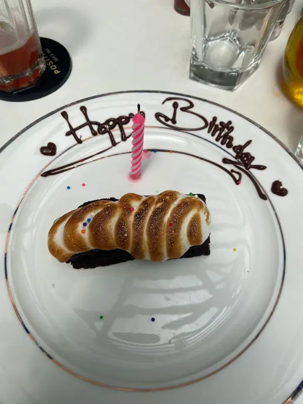 마지막 한 입을 먹으려는데, 직원분들이 깜짝 선물로 생일 축하 케이크를 준비해주셨습니다. 예상치 못한 선물에 정말 감동받았습니다. “Happy Birthday” 초콜릿 글씨가 새겨진 케이크는 보기에도 예뻤지만, 맛도 훌륭했습니다.