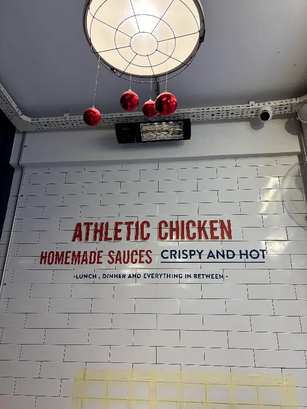 “ATHLETIC CHICKEN”이라는 문구가 돋보이는 벽면 인테리어.