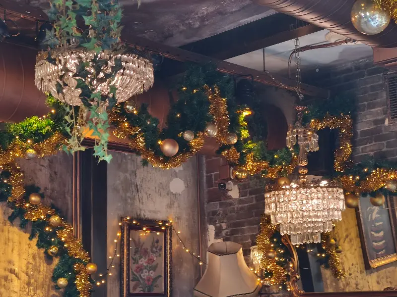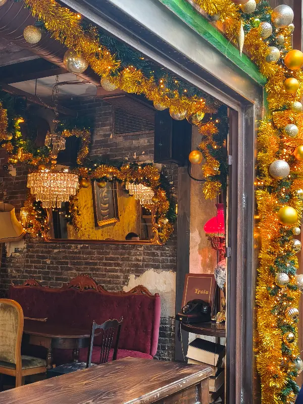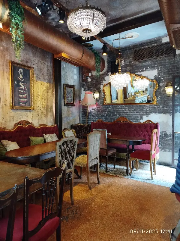 우푸파 에팝스의 첫인상은 강렬했다. 붉은 벽돌 벽, 앤티크 소파, 섬세한 샹들리에가 조화롭게 어우러져 마치 영화 세트장에 들어온 듯한 느낌을 자아냈다. 천장에는 화려한 샹들리에가 빛을 발하고, 벽면에는 고풍스러운 액자들이 걸려 있었다. 붉은 벨벳 소파와 나무 테이블은 편안함과 아늑함을 더했다. 특히 눈길을 사로잡는 것은 골드빛 장식이었다. 반짝이는 장식들은 공간에 화려함과 고급스러움을 더하며, 특별한 분위기를 연출했다.