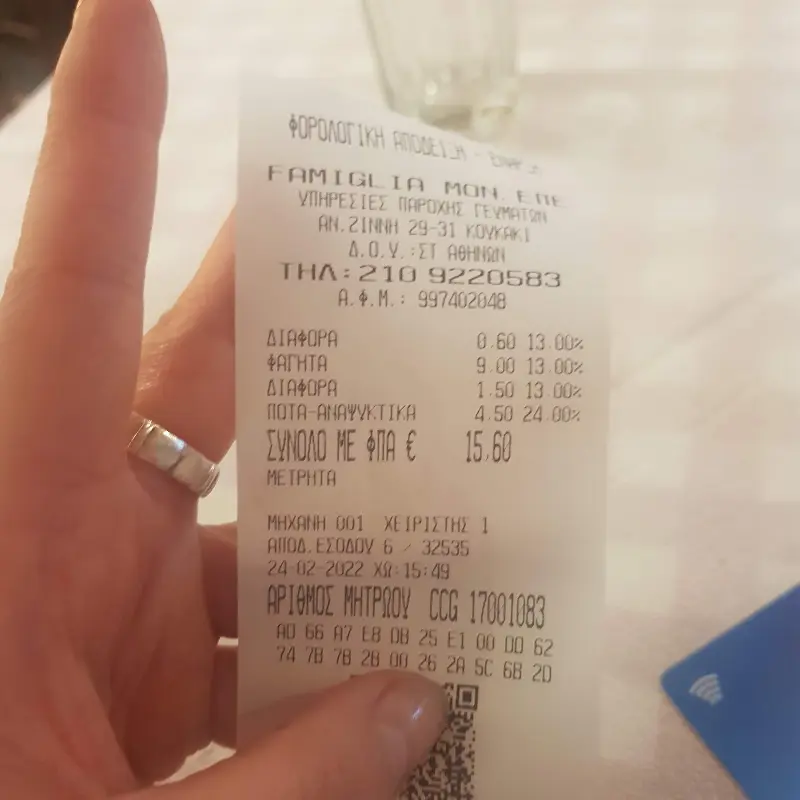 식사를 마치고 계산을 하니, 총 43유로가 나왔습니다. 훌륭한 음식과 친절한 서비스, 그리고 푸짐한 양을 고려하면, 매우 합리적인 가격이라고 생각합니다. 만약, 물과 관련된 실수가 있었다면, 주인장에게 직접 이야기하면 차액을 돌려받을 수 있습니다.