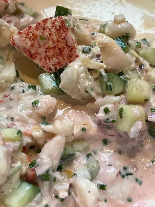 으깬 오이 요리. 신선한 재료와 드레싱의 조화가 훌륭하다. 특히 큼지막하게 썰린 재료들의 신선함이 눈으로도 느껴진다.