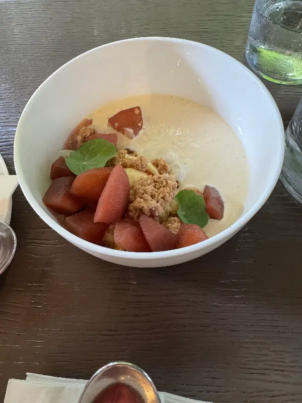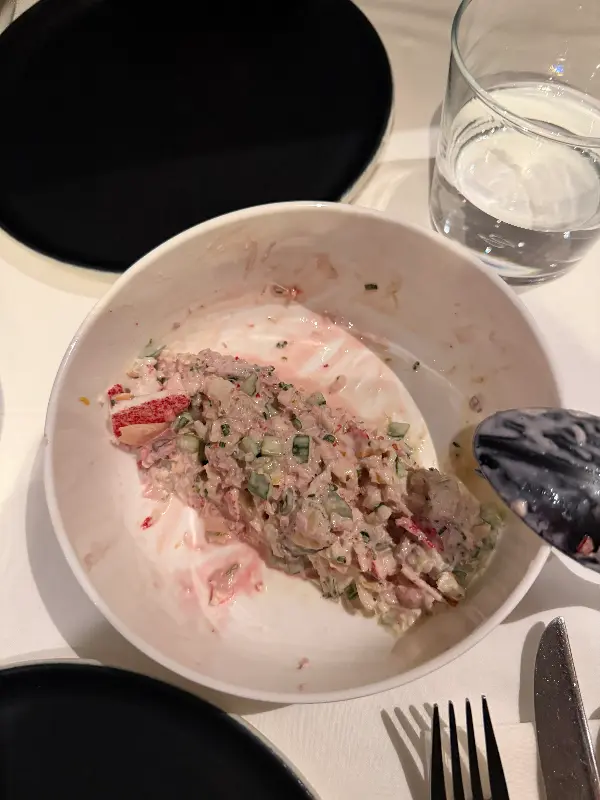 가장 먼저 으깬 오이 요리가 나왔다. 신선한 오이와 부드러운 그릭 요거트, 고소한 참깨의 조합이 신선했다. 특히 풍미 가득한 드레싱은 입맛을 돋우기에 충분했다. 이어서 나온 케피어 버터를 바른 빵은 따뜻하고 부드러웠다. 버터의 풍미와 빵의 고소함이 어우러져 환상적인 맛을 선사했다.