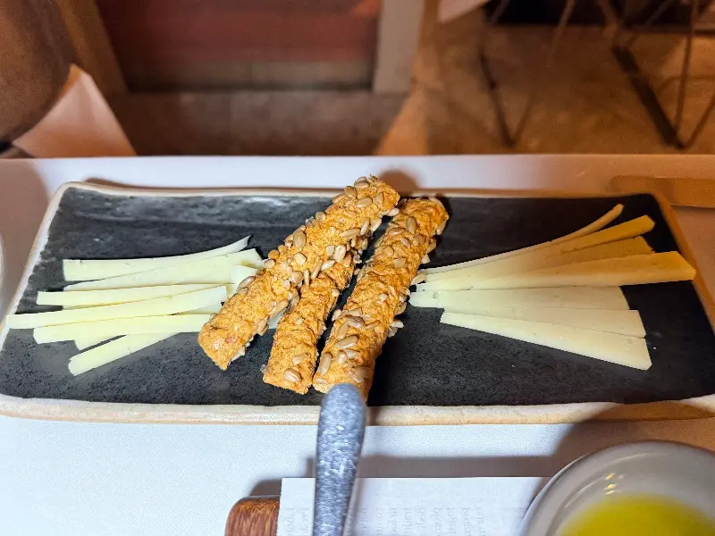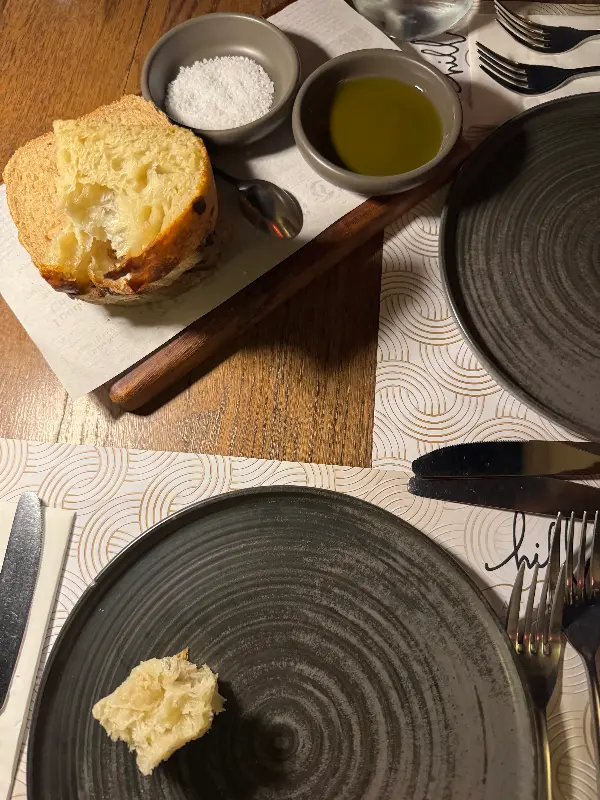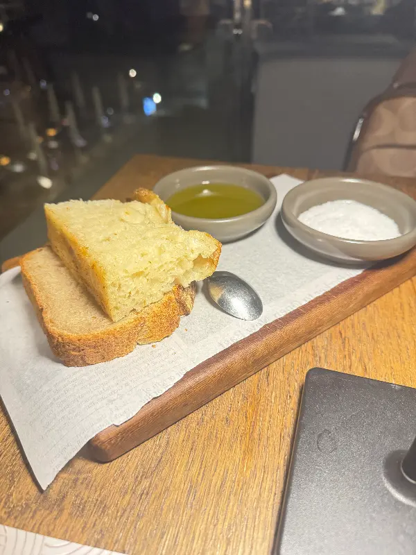 루프탑에 올라서자, 탄성이 절로 나왔습니다. 석양이 지면서 하늘은 붉게 물들고, 아크로폴리스는 은은한 조명 아래 그 웅장한 자태를 뽐내고 있었습니다. 마치 시간 여행을 떠나온 듯한 기분이었죠. 잠시 넋을 잃고 풍경을 감상하다 보니, 테이블에는 식전 빵과 올리브 오일이 놓여 있었습니다. 따뜻한 빵을 찢어 올리브 오일에 찍어 먹으니, 입안 가득 퍼지는 고소함이 식욕을 돋우었습니다.