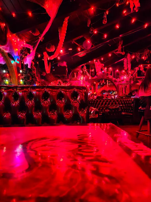 붉은 조명은 공간 전체를 감싸 안으며 몽환적인 분위기를 연출했습니다. 천장에는 거미줄과 붉은색 장식들이 늘어져 있어 독특한 개성을 드러냈습니다. 테이블 위에는 붉은빛이 반사되어 더욱 강렬한 인상을 주었습니다.