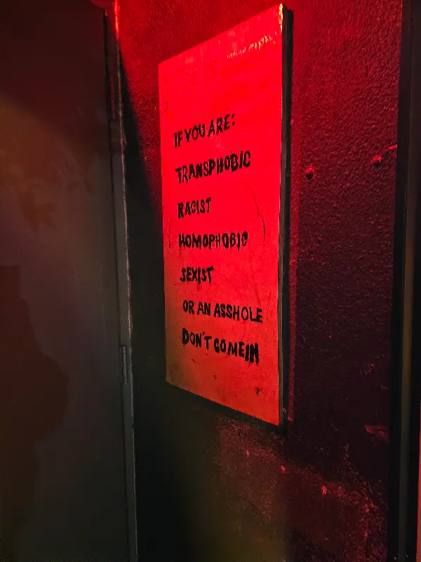 출입구 근처 벽에는 “If you are transphobic, racist, homophobic, sexist, or an asshole, DON’T COME IN”이라는 경고문이 붙어 있었습니다. 이는 이 공간이 추구하는 가치관을 명확하게 보여주는 듯했습니다. 하지만 몇몇 리뷰에서 언급된 사건들은 이러한 가치관과는 거리가 멀어 보였습니다.