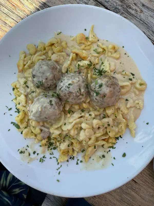 사우어브라텐 한 조각을 입에 넣으니, 부드러운 육질과 새콤한 소스가 조화롭게 어우러졌다. 특히 절인 적양배추는 아삭한 식감과 함께 독특한 풍미를 더했다. 슈페츨은 쫄깃하면서도 부드러웠다. 양도 정말 푸짐해서, 배부르게 즐길 수 있었다. 샐러드는 신선하고 상큼했다. 다양한 절인 채소들이 입안을 개운하게 만들어 줬다. 특히 절인 비트는 달콤하면서도 쌉쌀한 맛이 일품이었다.