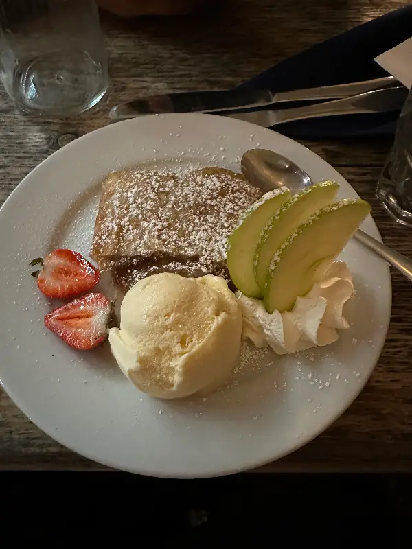 디저트로는 애플 슈트루델을 주문했다. 따뜻한 사과와 바삭한 페이스트리의 조화는 언제나 옳다. 슈트루델 위에 뿌려진 슈가파우더가 달콤함을 더했다. 한 입 베어 무니, 입안 가득 퍼지는 사과의 향긋함과 시나몬의 은은한 향이 행복감을 선사했다. 곁들여진 아이스크림은 차가우면서도 달콤했다. 따뜻한 슈트루델과 함께 먹으니, 그 맛이 더욱 환상적이었다.
