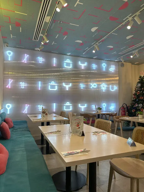 푸시아의 내부 인테리어는 밝고 쾌적합니다. 테이블 간 간격도 넓어 편안하게 식사를 즐길 수 있습니다. 천장에 독특한 패턴이 그려져 있는데, 이는 푸시아만의 개성을 드러내는 요소입니다. 은은한 조명은 아늑한 분위기를 조성하며, 친구, 연인, 가족과 함께 즐거운 시간을 보내기에 좋습니다. 사진에서 볼 수 있듯이 벽면에 비춰지는 은은한 조명이 만들어내는 독특한 분위기가 인상적입니다.