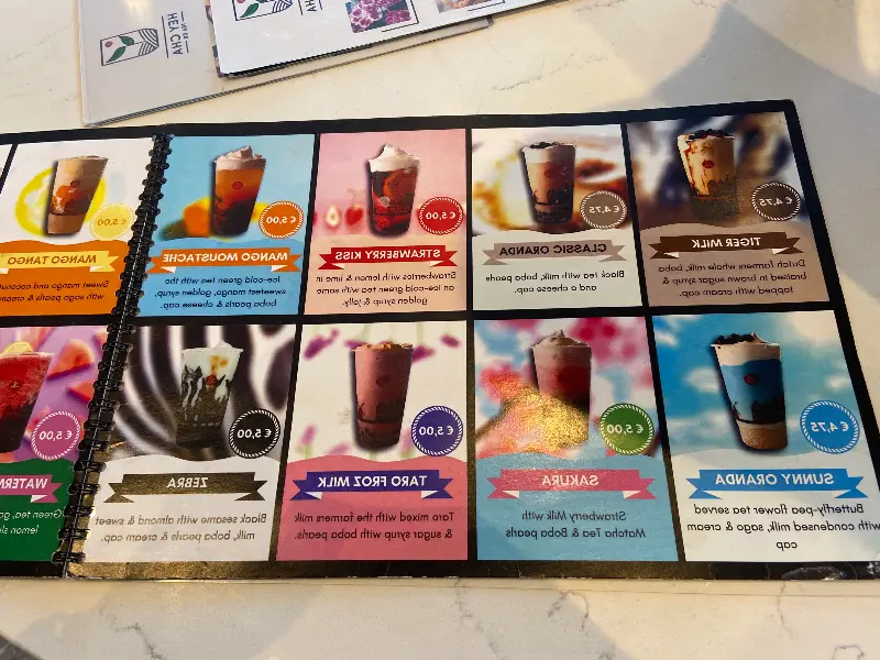 라면으로 든든하게 배를 채운 후, Hey Cha의 또 다른 주인공인 버블티를 맛보기로 했다. 메뉴판에는 다양한 종류의 버블티가 있었는데, 그중에서도 ‘제브라 밀크’와 ‘무설탕 팥 우유’가 눈에 띄었다. 메뉴판을 보니 ‘망고 머스타드’나 ‘스트로베리 키스’처럼 독특한 이름의 버블티도 있었다.
