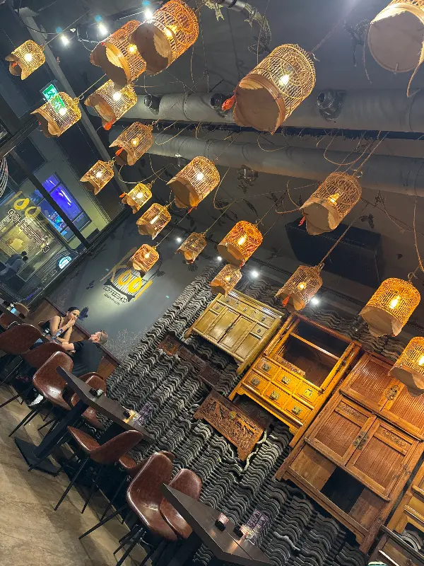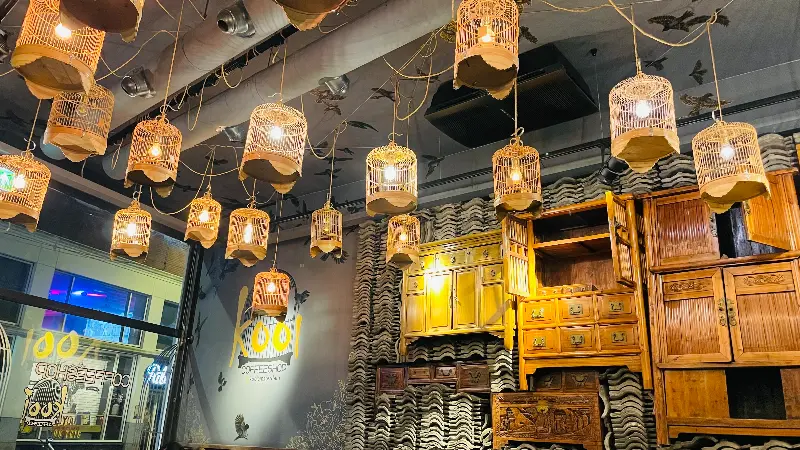Koi Coffeeshop의 첫인상은 단연 인테리어였습니다. 천장에는 마치 새들이 날아다니는 듯한 새장 모양의 조명이 가득했습니다. 은은하게 빛나는 조명 아래, 고풍스러운 가구들이 조화롭게 배치되어 아늑하면서도 몽환적인 분위기를 자아냈습니다. 벽은 손으로 직접 칠했다고 하는데, 그 정성이 느껴지는 섬세한 디테일이 인상적이었습니다.