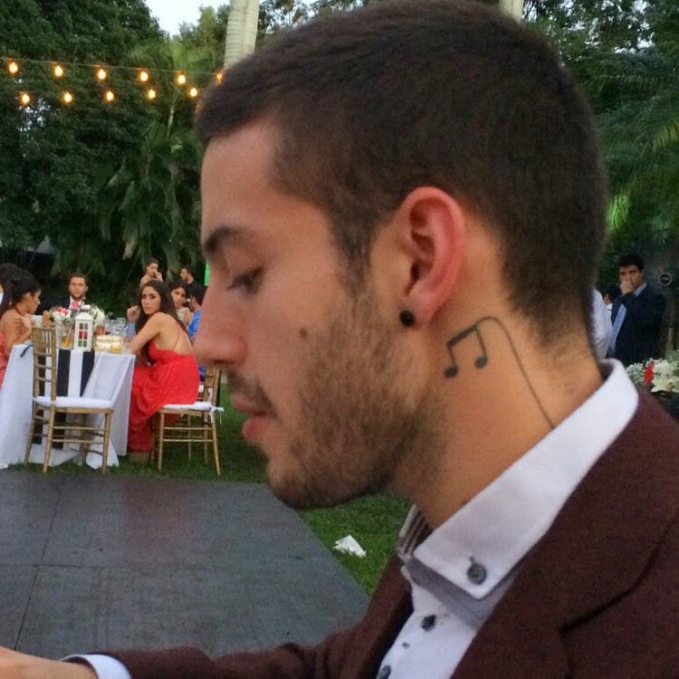 음악 노트를 목에 문신으로 새긴 남성이 편안하고 자유로운 분위기에서 식사를 즐기고 있습니다. 주변의 따뜻한 조명과 테이블이 아늑한 저녁 식사를 연상시킵니다.