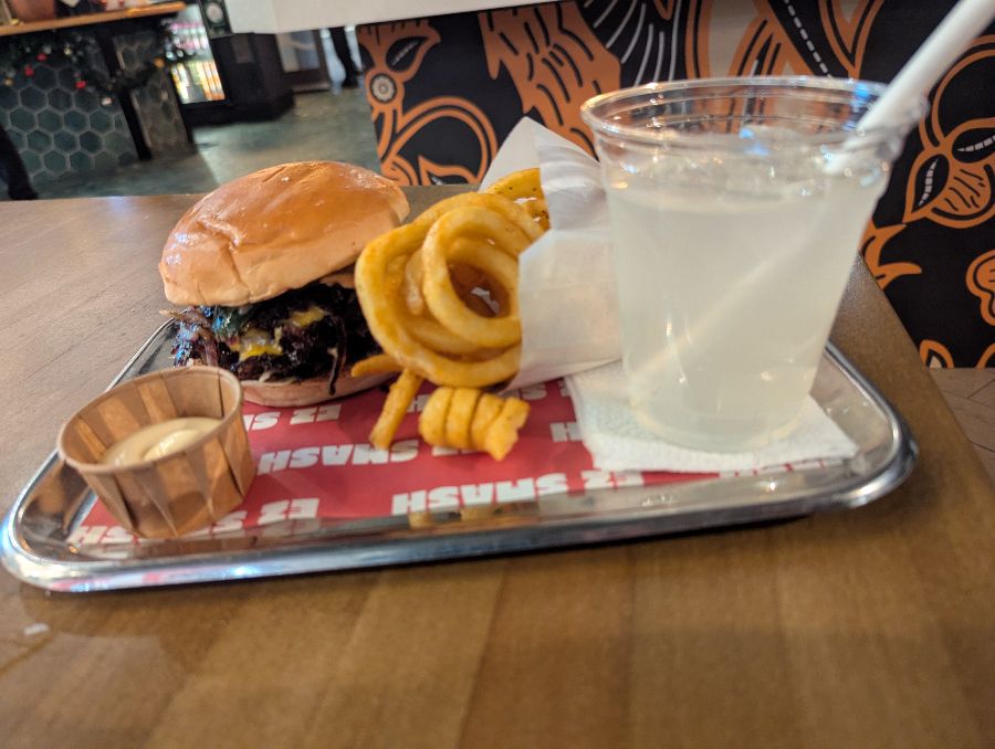 컬리 프라이와 버거, 그리고 시원한 레모네이드가 완벽하게 한 상 차려진 모습입니다. 은색 쟁반 위에 놓여 깔끔하고 먹음직스럽게 보입니다.