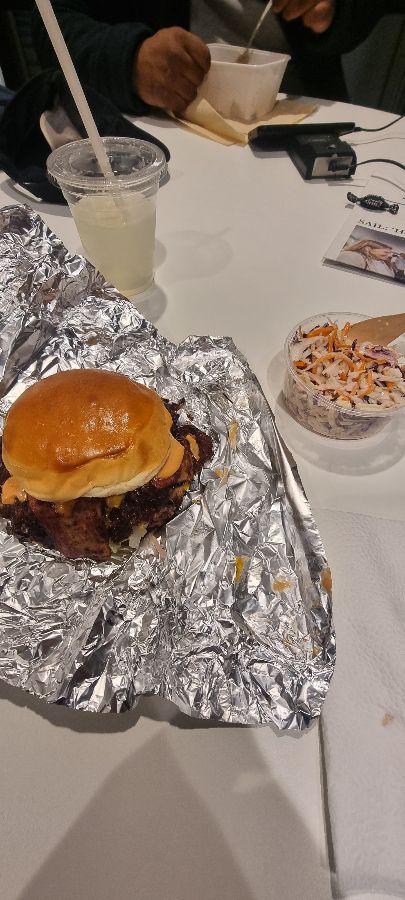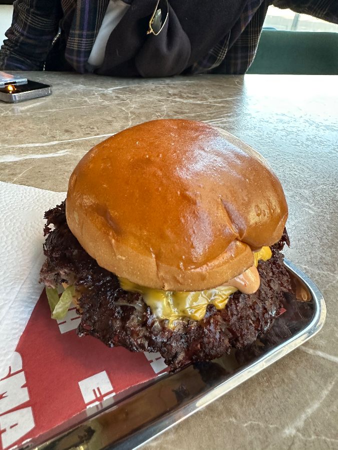 손에 들고 있는 거대한 스매시 버거는 넉넉한 양의 패티와 신선한 채소, 그리고 특제 소스의 조합이 어우러져 보는 것만으로도 식욕을 자극합니다.