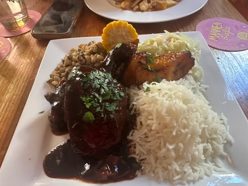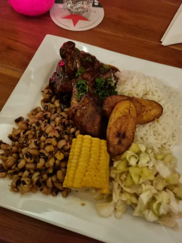 할렘 출신이라는 한 방문객은 저크 치킨에 대해 “저크 치킨 맛과는 전혀 다르지만, 그렇다고 맛이 없다는 건 아닙니다.”라고 평가했습니다. 전통적인 소울 푸드와는 다소 차이가 있을 수 있지만, 이곳만의 개성이 담긴 특별한 맛은 분명 매력적입니다. 검은콩과 양배추를 곁들여 먹으니 더욱 풍성한 맛을 즐길 수 있었습니다.