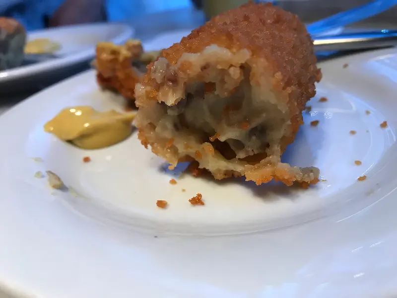 반으로 가른 크로켓 단면. 촉촉한 속 재료와 바삭한 튀김옷의 조화가 완벽하다. 톡 쏘는 머스타드를 살짝 곁들여 먹어도 좋다.