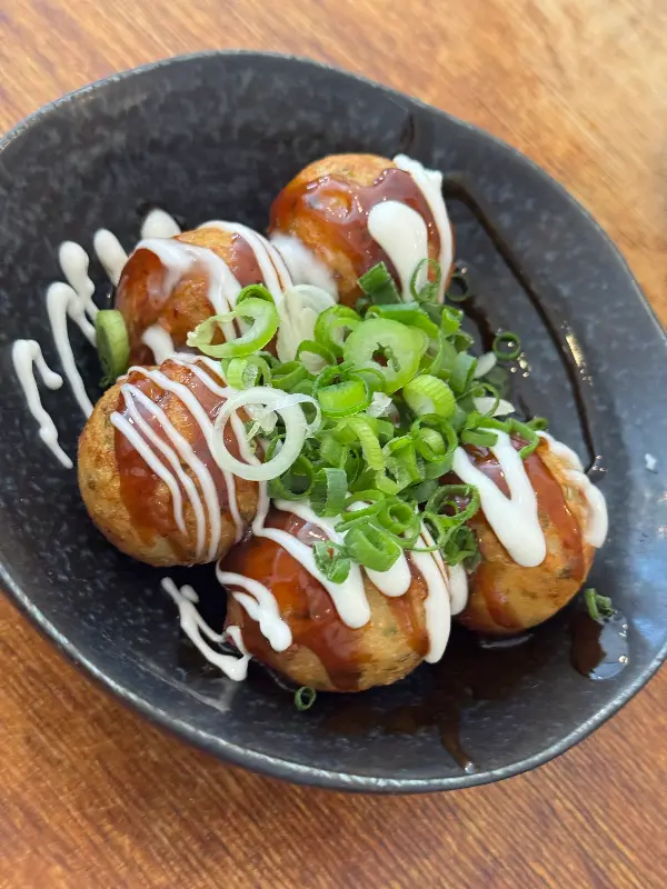 겉은 바삭, 속은 촉촉한 타코야끼 위에 뿌려진 소스가 환상적인 조화를 이룬다.