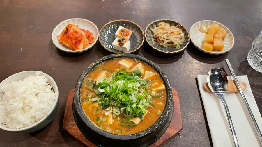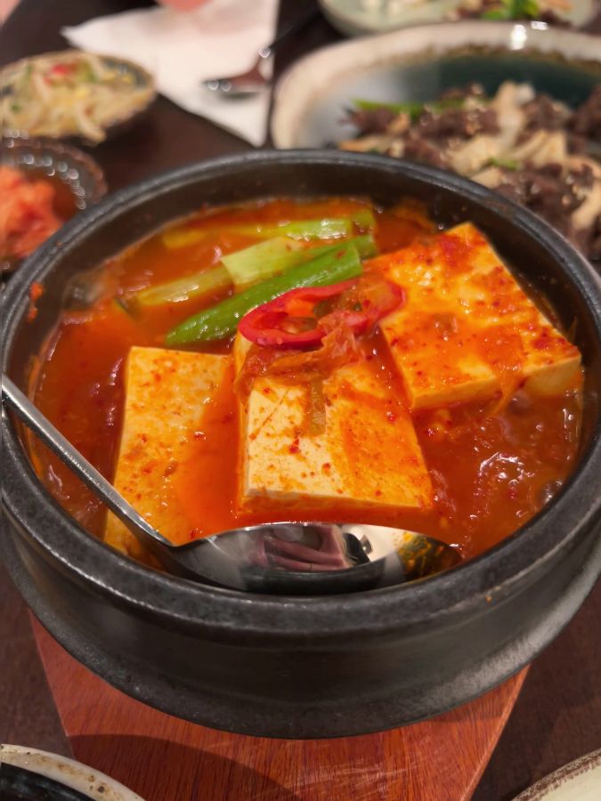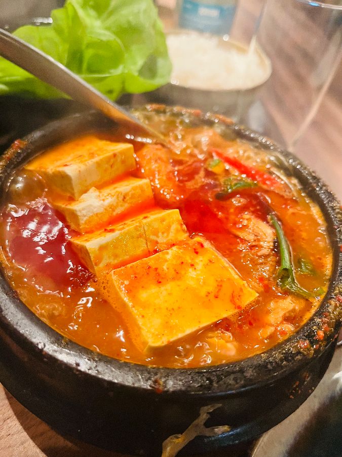 가장 먼저 나온 김치찌개는 뚝배기 안에서 보글보글 끓고 있었다. 큼지막하게 썰린 두부와 김치가 빨간 국물 속에서 춤추는 듯한 모습이 식욕을 자극했다. 국물을 한 입 떠먹으니, 깊고 진한 김치의 풍미가 입안 가득 퍼졌다. 마치 오랜 시간 푹 끓인 듯한 깊은 맛이었다.