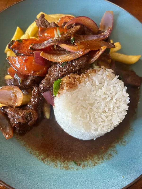 세비체의 감동이 채 가시기도 전에, 두 번째 메뉴인 로모 살타도가 등장했습니다. 짭짤하면서도 감칠맛도는 소스에 버무려진 소고기와 채소, 그리고 곁들여진 밥과 감자튀김의 조화는 보기만 해도 군침이 돌았습니다.