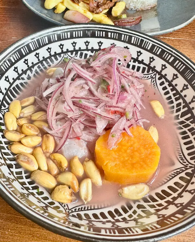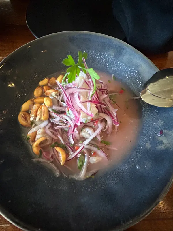 자리에 앉자마자 메뉴판을 정독했습니다. 페루 음식은 처음이라 설렘 반, 기대 반이었죠. 고민 끝에 첫 번째 메뉴로 세비체를 선택했습니다. 잠시 후, 눈 앞에 놓인 세비체의 모습은 정말 환상적이었습니다. 신선한 해산물과 채소들이 아름다운 조화를 이루고 있었죠.