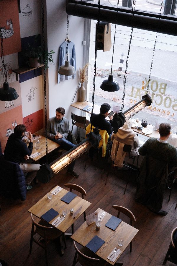 창밖 풍경이 그림처럼 펼쳐지는 Box Sociaal 1층의 아늑한 공간. 이미 많은 손님들로 활기찬 분위기다.
