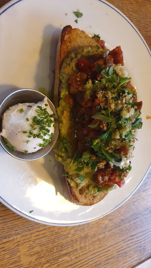 아보카도와 수란, 스크램블 에그가 완벽한 조화를 이루는 브런치 플레이트. 신선함이 돋보인다.