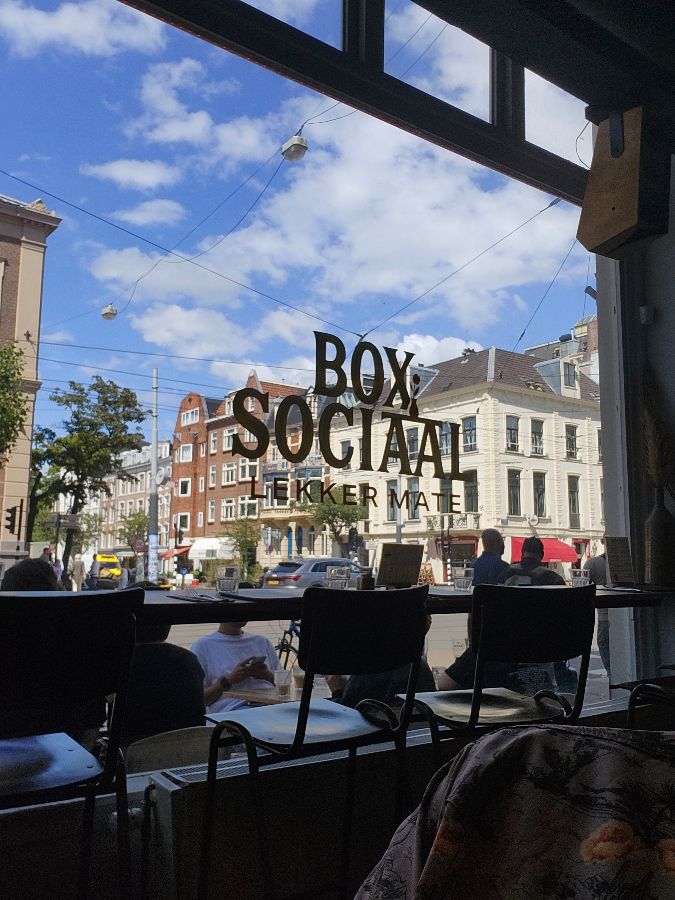 Box Sociaal은 아담한 2층짜리 레스토랑으로, 건물 외관부터 따뜻하고 아늑한 분위기를 풍긴다. 붉은 벽돌과 커다란 유리창은 지나가는 이들의 시선을 사로잡으며, 마치 영화 속 한 장면에 들어서는 듯한 기대를 안겨준다. 오전 11시 15분, 예약을 하고 방문했음에도 이미 많은 손님들로 북적이는 모습은 이곳이 얼마나 사랑받는 맛집인지 여실히 보여준다. 테이블마다 정갈하게 놓인 식기류와 은은한 조명은 아늑함을 더하고, 창밖으로 보이는 암스테르담의 풍경은 그 자체로 그림이 된다.
