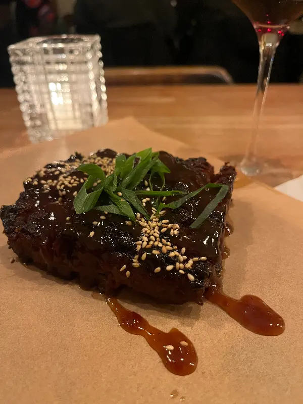 다음으로 맛본 메뉴는, 윤기가 흐르는 갈비였습니다. 겉은 바삭하고 속은 촉촉한 갈비는, 입에 넣는 순간 사르르 녹아내리는 듯했습니다. 달콤 짭짤한 양념은 밥 한 공기를 순식간에 비우게 만드는 마성의 맛이었습니다. 함께 제공된 신선한 야채는 갈비의 느끼함을 잡아주어, 더욱 깔끔하게 즐길 수 있었습니다.