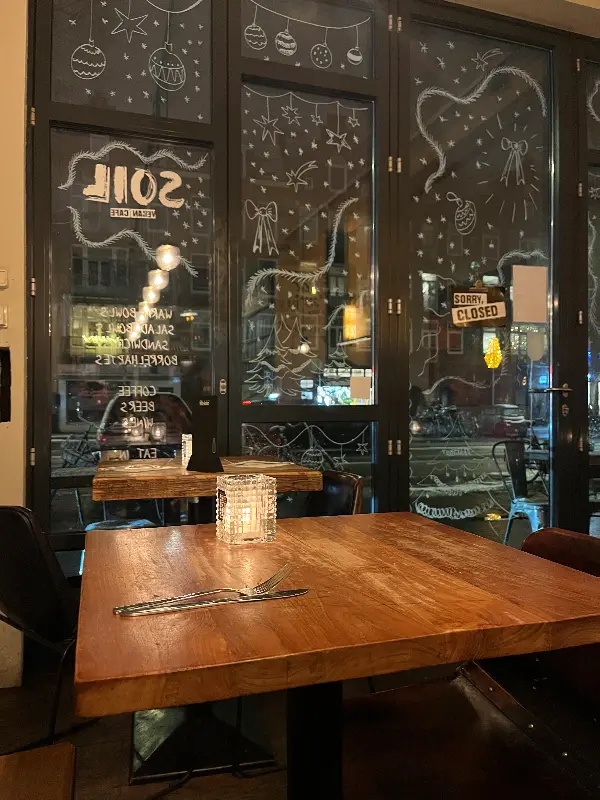 차가운 바람이 뺨을 스치는 겨울, 암스테르담의 거리는 낭만적인 설렘으로 가득했습니다. 숙소에서 다소 떨어진 곳이었지만, 비건 음식에 대한 기대를 가득 안고 ‘Soil’을 향해 나섰습니다. 눈 덮인 풍경을 헤치고 도착한 그곳은, 따뜻한 불빛과 아늑한 분위기로 지친 몸과 마음을 녹여주는 듯했습니다.