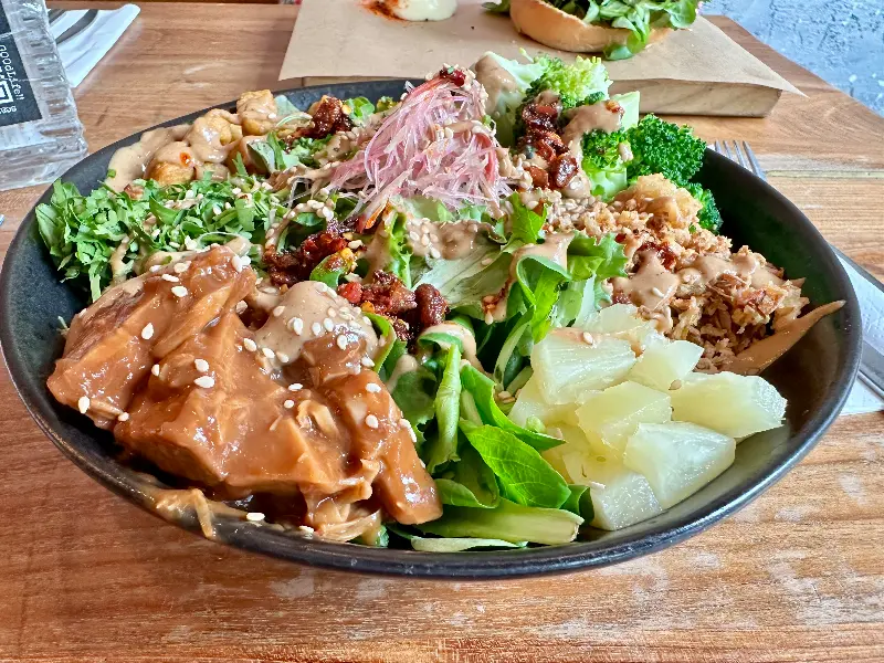 비건 치킨 버거는, 겉은 바삭하고 속은 촉촉한 패티가 인상적이었습니다. 빵 또한 부드러워서, 전체적인 조화가 훌륭했습니다. 김치 볶음밥은, 살짝 매콤하면서도 감칠맛이 느껴지는 것이 특징이었습니다. 다만, 다른 메뉴들에 비해 단백질이 부족한 점이 아쉬웠습니다.