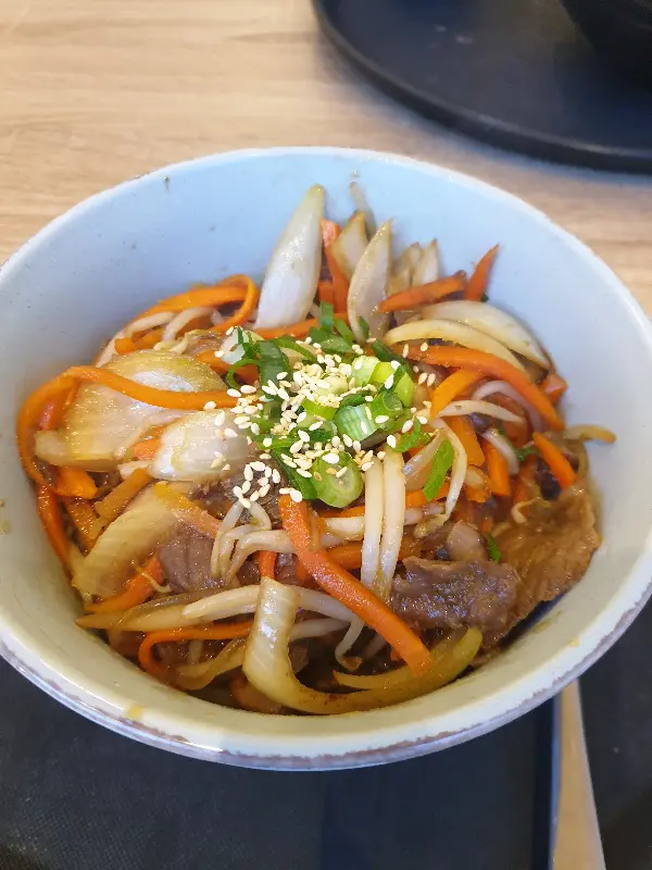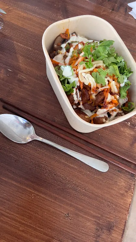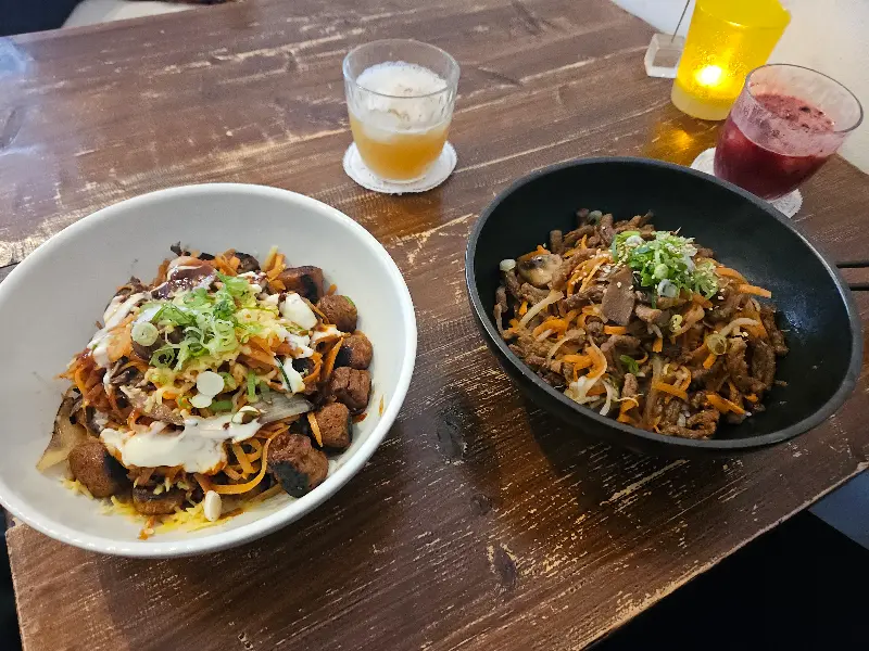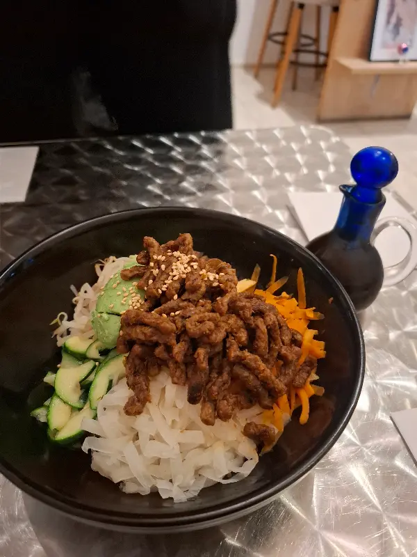불고기덮밥을 주문했습니다. 윤기가 자르르 흐르는 밥 위에 불고기, 채소가 보기 좋게 담겨 나옵니다. 젓가락으로 한 입 가득 떠서 입에 넣으니, 달콤 짭짤한 불고기 양념이 입안 가득 퍼집니다. 고기가 들어가지 않았음에도 불구하고, 콩으로 만든 불고기는 훌륭한 식감과 풍미를 자랑합니다. 신선한 채소는 아삭아삭 씹히는 맛을 더하고, 밥알 하나하나에 양념이 잘 배어 있어 쉴 새 없이 숟가락을 움직이게 됩니다.