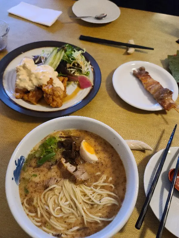 테이블 위 라멘, 꼬치, 샐러드가 놓여져 풍성한 식사를 예감케 한다.
