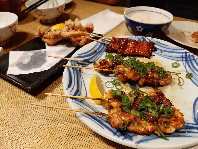 주문한 음식이 나오기 시작하자, 테이블은 순식간에 맛있는 음식들로 가득 찼다. 윤기가 자르르 흐르는 야키토리는 보기만 해도 군침이 돌았다. 돼지고기와 닭고기를 기본으로 다양한 부위를 맛볼 수 있도록 여러 종류를 시켜보았다.