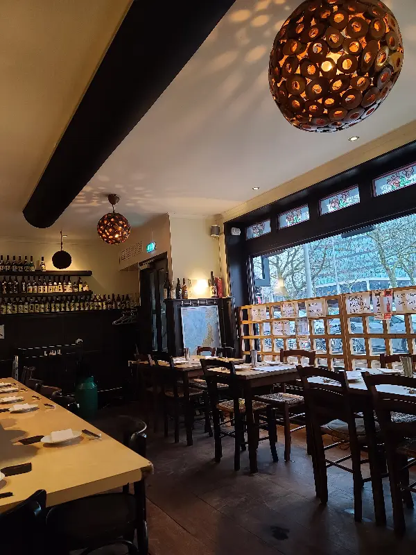 암스테르담의 저녁, 은은한 조명이 거리를 비추는 가운데, 기대감을 안고 이자카야의 문을 열었다. 문을 열자마자 풍겨오는 야키토리 굽는 향긋한 연기는 미각을 자극하며 기대감을 한층 더 고조시켰다. 내부는 일본 특유의 아늑하고 정감 있는 분위기로 가득 차 있었다. 나무 테이블과 톤 다운된 벽면, 그리고 은은하게 빛나는 조명이 어우러져 편안하면서도 활기찬 느낌을 주었다.