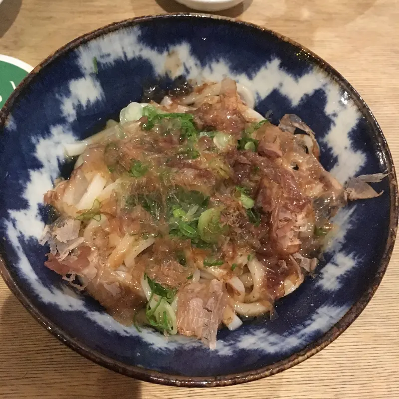 가쓰오부시가 듬뿍 올려진 우동, 풍성한 맛과 향이 일품이다.