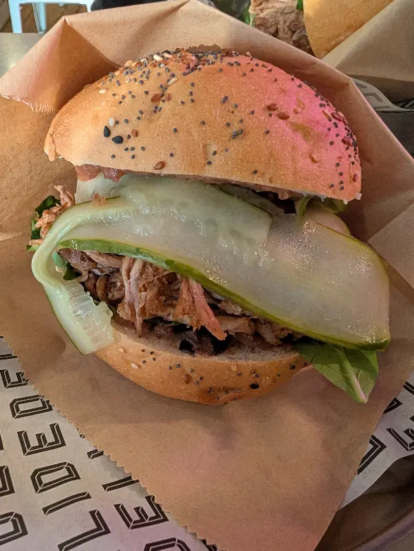 De Deli의 풀드 포크 샌드위치는 부드러운 고기와 아삭한 야채의 조화가 훌륭합니다.