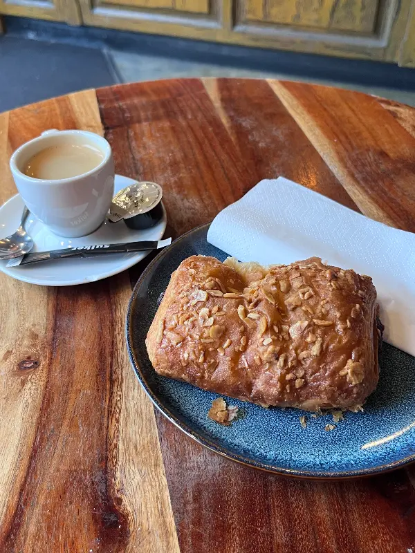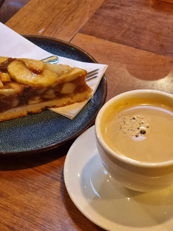 이곳의 대표 메뉴는 아메리카노와 애플파이 세트입니다. 6유로라는 저렴한 가격에 훌륭한 맛을 즐길 수 있어, 많은 여행자들의 사랑을 받고 있습니다. 애플파이는 겉은 바삭하고 속은 촉촉하며, 사과의 달콤함과 시나몬 향이 조화롭게 어우러져 입안 가득 행복을 선사합니다. 아메리카노는 네덜란드 스타일로, 고소함보다는 쌉쌀한 맛이 강하지만, 애플파이의 달콤함과 완벽한 균형을 이룹니다.