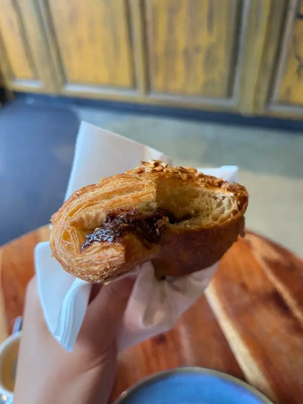 애플파이 외에도 다양한 빵과 음료를 즐길 수 있습니다. 초코 크로와상은 달콤하고 부드러우며, 플랫 화이트와 카페라떼는 부드러운 우유 거품과 진한 커피의 조화가 일품입니다. 특히 1PIECE STROOPWAFFEL에 아메리카노 또는 카페라떼를 곁들여 먹으면 더욱 풍성한 맛을 느낄 수 있습니다. 밥을 먹고 와서 빵을 시키지 않았더라도, 다양한 종류의 빵을 구경하는 재미도 쏠쏠합니다.